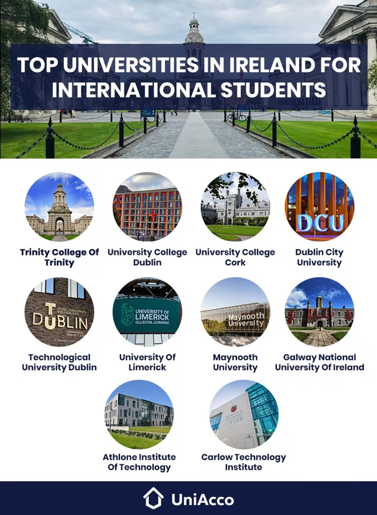 | University College Dublin (UCD) | Dublin | University | Liberal Arts, Languages, History | Biochemistry, Physics, Environmental Science | Commerce, Business Analytics | Computer Science, Data Science | Nursing, Medicine, Public Health | Official Link |